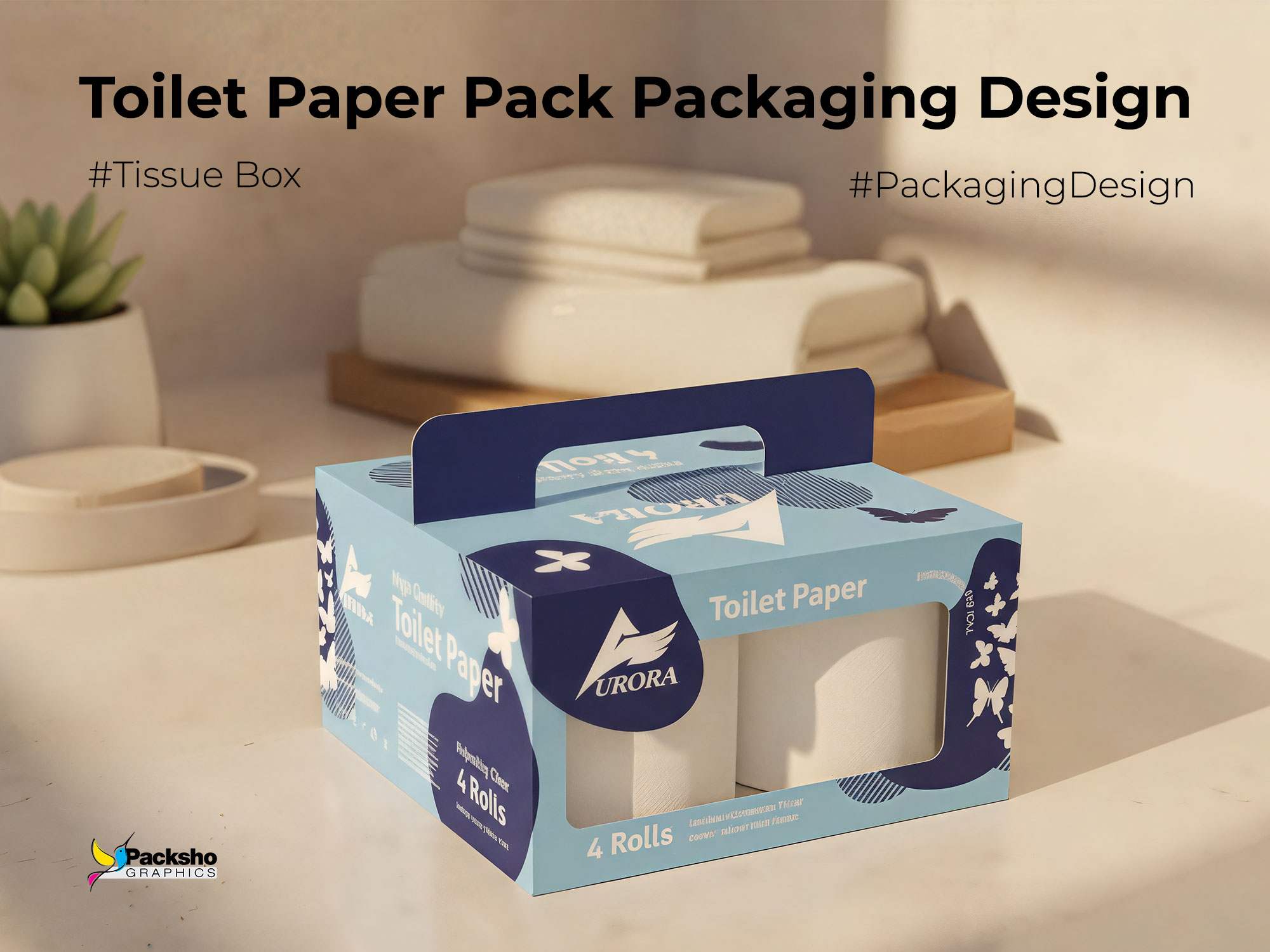The Aurora Toilet Paper Pack of 4 Packaging Design exemplifies the harmony between functional packaging structure and refined visual branding. Conceived and executed by Packsho Agency, this project transforms an everyday household item into a well-branded, memorable, and practical retail experience. Designed for convenience and visual appeal, the packaging features a smart top-handle structure, precision-cut viewing windows, and a clean, modern graphic identity that reflects the brand’s emphasis on freshness, softness, and purity.